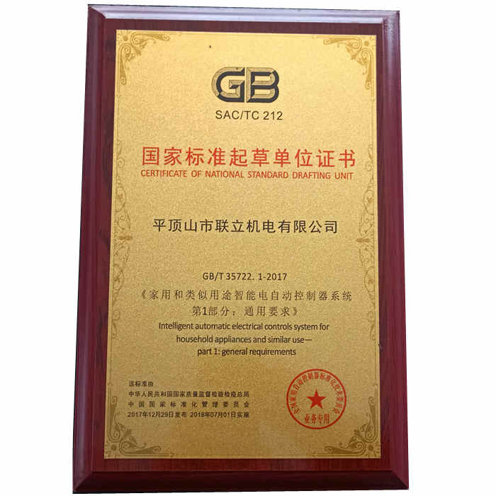 國家標(biāo)準(zhǔn)起草單位證書